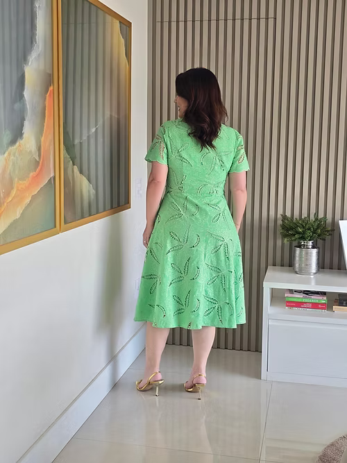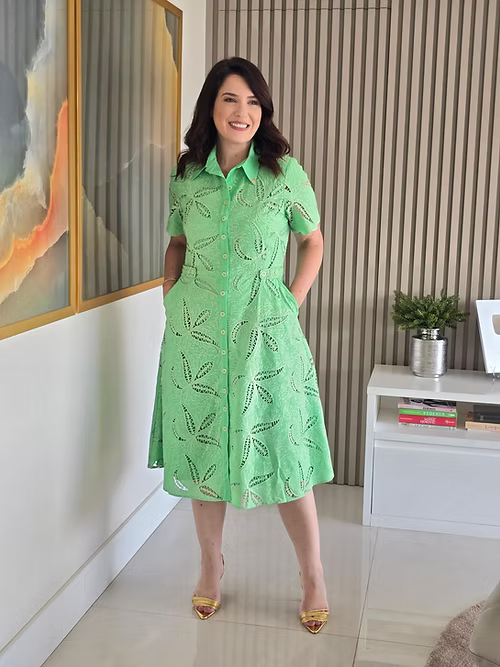 Chamise em Linho Bordado - Katharine - Peça confeccionada em linho bordado, gola de camisa, botões funcionais, bolsos funcionais, modelagem mais ajustada no corpo na parte superior, e parte inferior corte evaze, comprimento midi, chamise forrado.