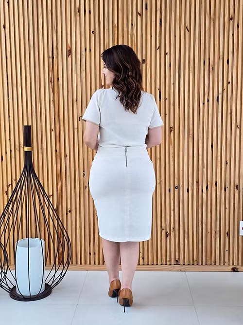 Saia em modelagem reta, zíper nas costas, bolsos funcionais, comprimento altura do joelho e saia toda forrada.