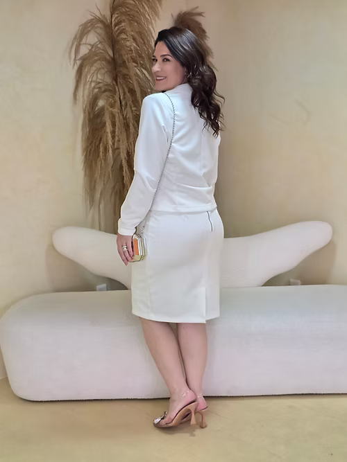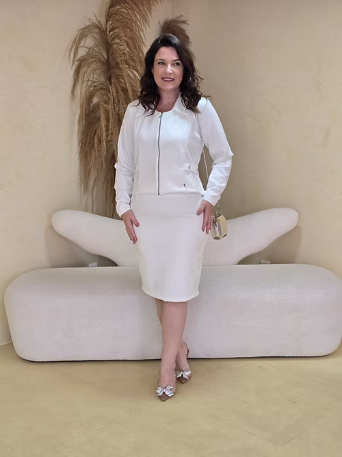 Conjunto Saia e Casaquinho em Suede - Jade - Peça confeccionada em Suede Scuba encorpado, Casaquinho com ziper de metal e detalhe martingale nas laterais, Saia comprimento na altura do joelho toda forrada. Conjunto é composto por Casaquinho e Saia.